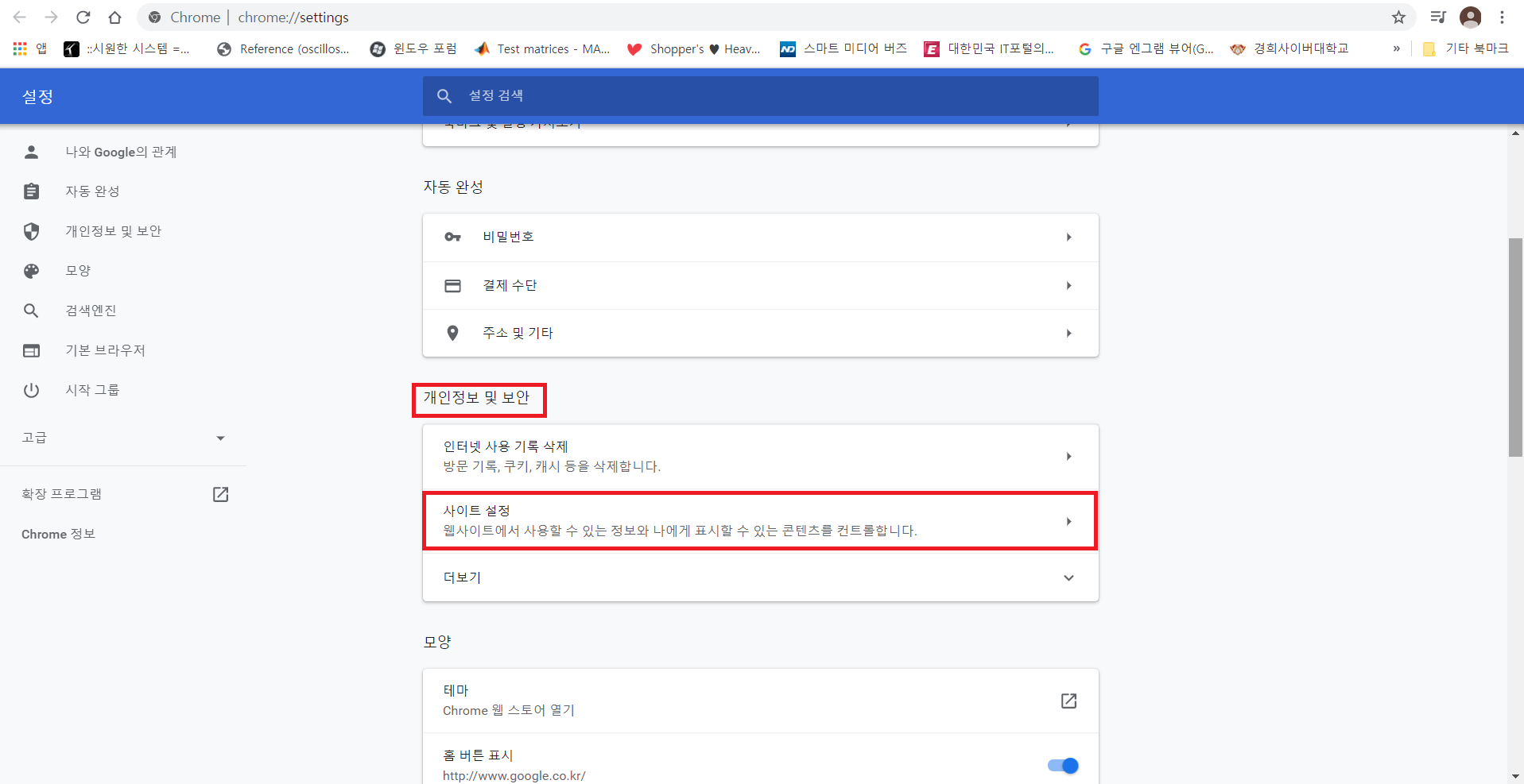 사이트 설정 메뉴를 찾습니다.