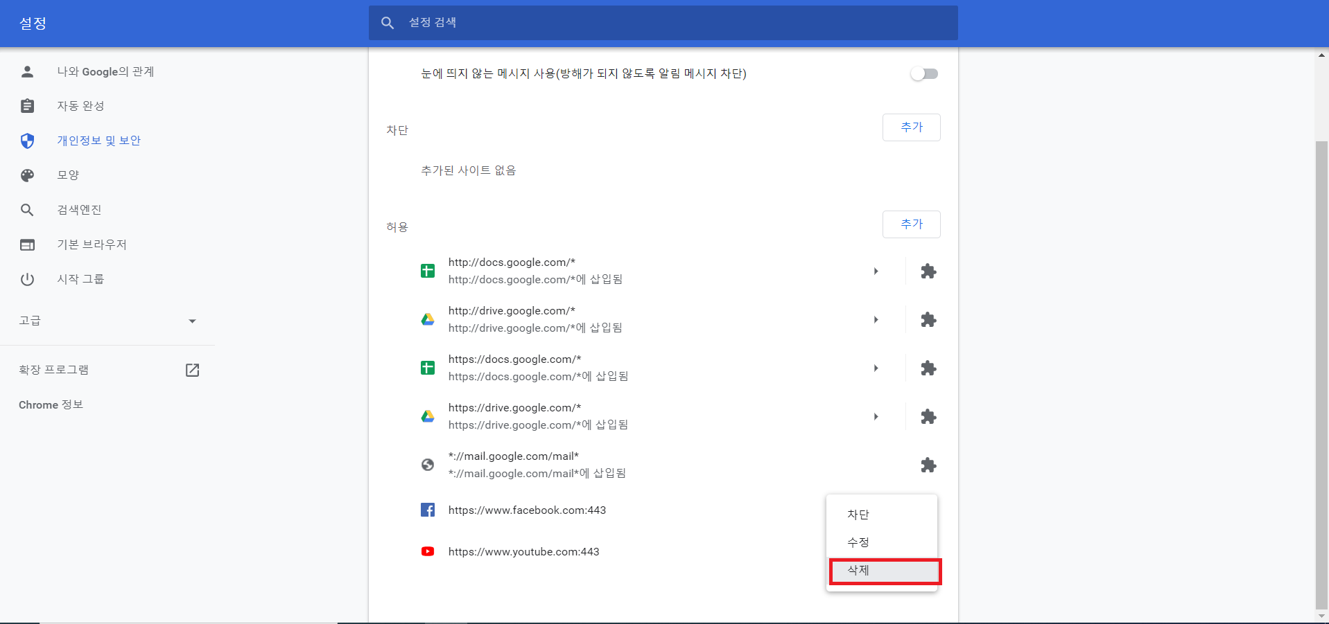 사이트 설정 메뉴를 찾으셨으면 클릭합니다.