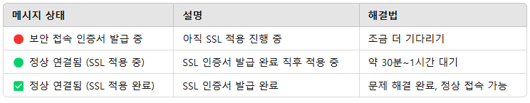 - 도메인을 연결한 직후, https:// 로 접속하면 에러가 뜨지만,