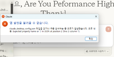 혻) 가 포함되어 (C:\...\type claude_desktop_config.json출력 결과) "Expected property name or '}'..." 오류가 계속 발생했습니다. - 해결: JSON 내용을 완전히 삭제 후, 문법에 맞는 깨끗한 코드를 붙여넣고 UTF-8(BOM 없음) 인코딩으로 저장하여 해결했습니다.