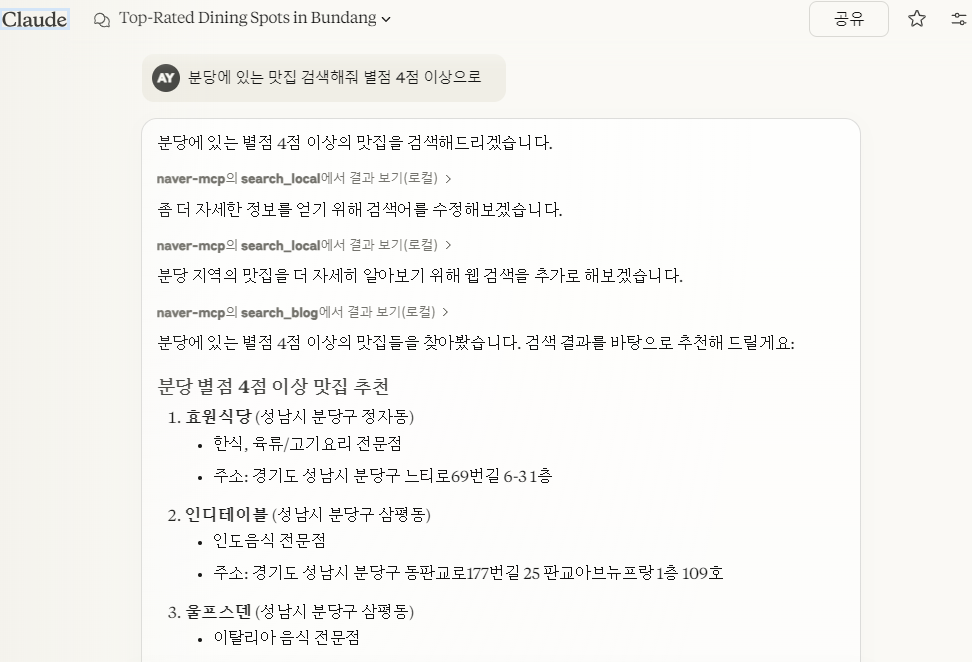 이 설정을 적용하고 Claude 데스크톱 앱을 재시작하자, 드디어! Claude가 naver-mcp 서버에 성공적으로 연결하고 search_local, search_blog 등의 도구를 사용하여 Naver 검색 결과를 가져오는 것을 확인할 수 있었습니다.