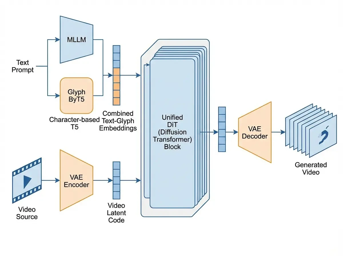 이 모델의 가장 큰 특징은 텍스트-투-이미지(T2I), 텍스트-투-비디오(T2V), 이미지-투-비디오(I2V)를 별도의 모델이 아닌 하나의 통합된 아키텍처에서 처리한다는 점입니다.