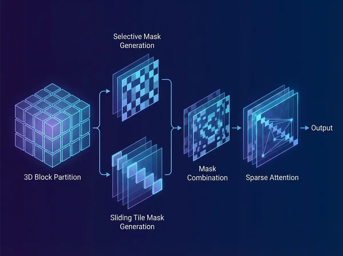 Hunyuan Video 1.5는 이를 해결하기 위해 SSTA (Selective and Sliding Tile Attention)라는 독자적인 희소 어텐션 메커니즘을 제안했습니다.