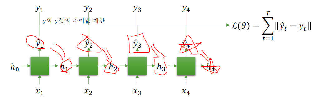 h1이 결국 y햇1이 되고, 그게 바로 출력 값이다. 나머지도 마찬가지로 h2가 y햇2 즉 h가 y햇이 된다. 그래서 실제 y값과 차이를 계산하는 방식으로 RNN은 동작하게 된다.