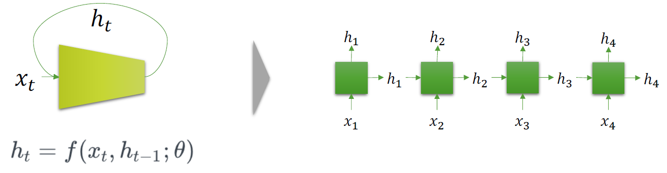 여기서 나오는 h가 곧 출력 y햇을 뜻한다. 보면 가중치가 W_ih와 W_hh로 나뉘게 된다. 입력 x에 대해선s 가중치 W_ih가 곱해지고, 출력 h가 다시 입력으로 들어올 때는 가중치 W_hh가 곱해지게 된다. 이걸 조금 더 쉽게 이해하기 위해 RNN 모델을 펼쳐보면 다음과 같다.