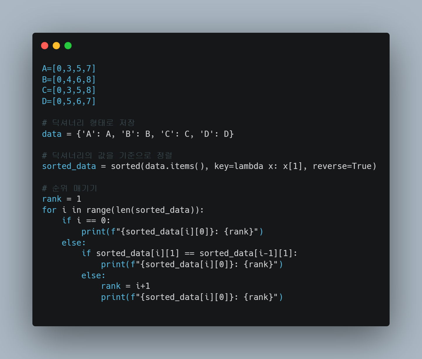 이렇게 함수를 이용하여 리스트의 순위를 매기면, 더 복잡한 문제에서도 함수를 일반화하여 적용할 수 있으며, 코드의 가독성과 재사용성을 높일 수 있습니다.