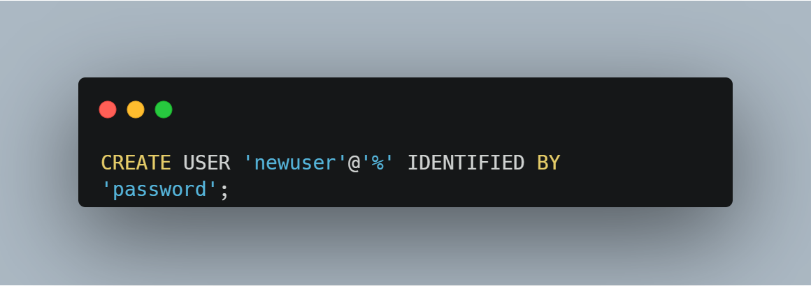CREATE USER 'newuser'@'%' IDENTIFIED BY 'password';